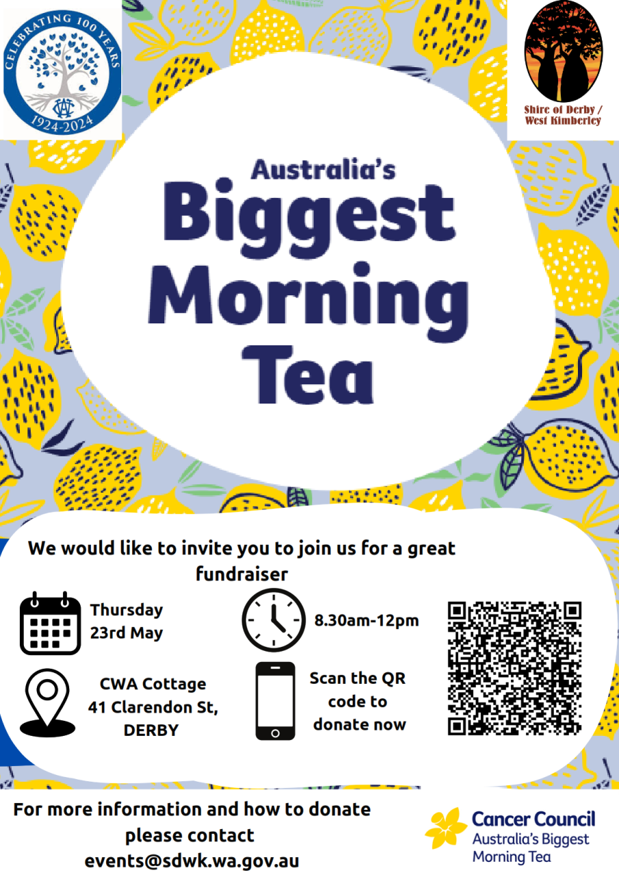 Come and join in the fundraising efforts whilst enjoying some delicious morning tea being co-hosted by the Derby West Kimberley Air Country Woman's Association and the SDWK.
