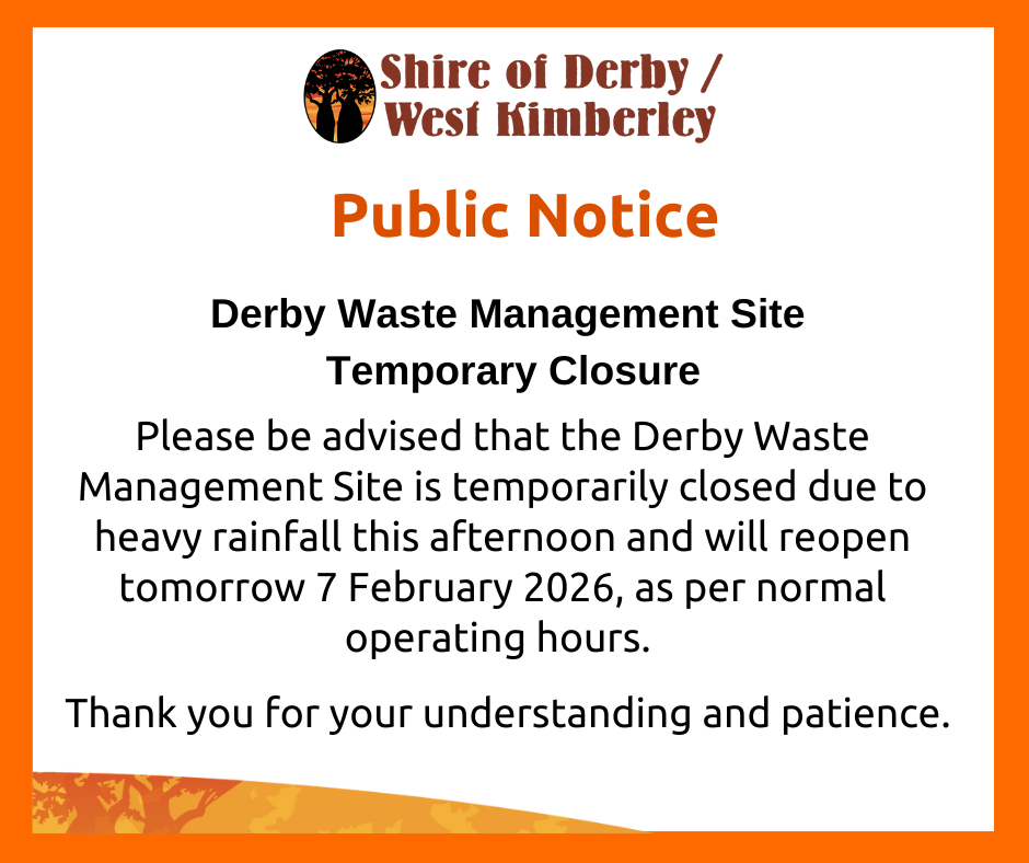 Shire of Derby/West Kimberley would like to advise that the Derby Waste Management Site is temporarily closed due to heavy rainfall this afternoon and will reopen tomorrow 7 February 2026, as per normal operating hours.