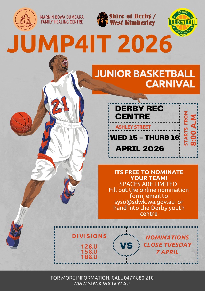 Get your team together and be part of Jump4it 2026 at the Derby Recreation Centre. The Jump4it Carnival will run from Wednesday 15 - Thursday 16 April 2026, starting from 8:00 AM each day.