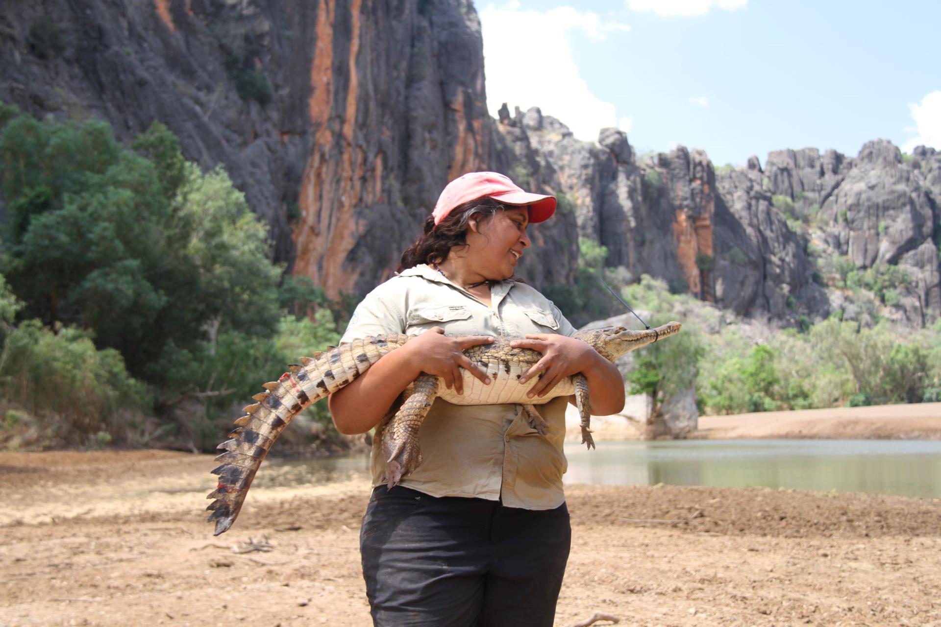 Image: Natalie Davey holding a croc as part of a 2017 wildlife survey. Photo Credit Max Jackson.