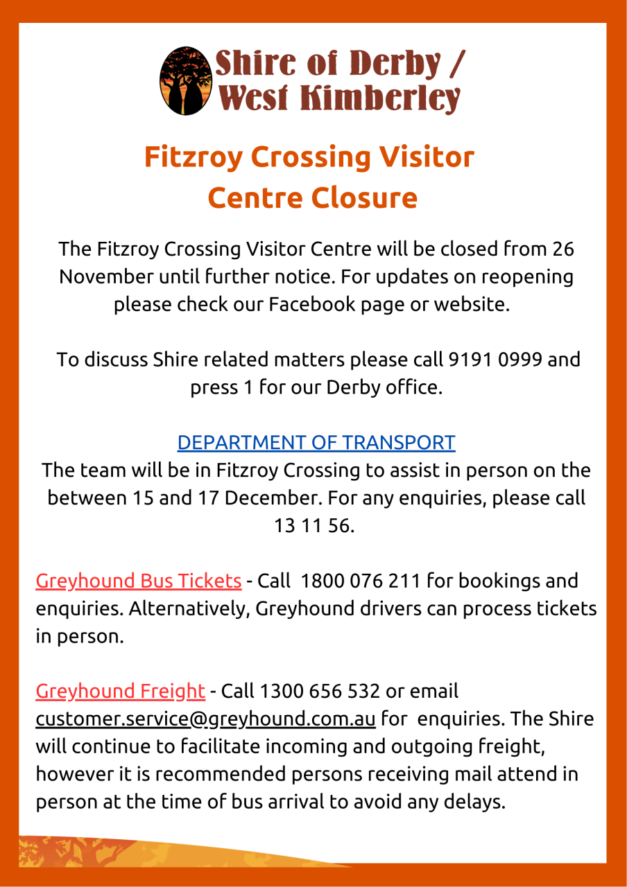 The Shire would like to advise the community that the Fitzroy Crossing Visitor Centre will be closed from 26 November 2025.