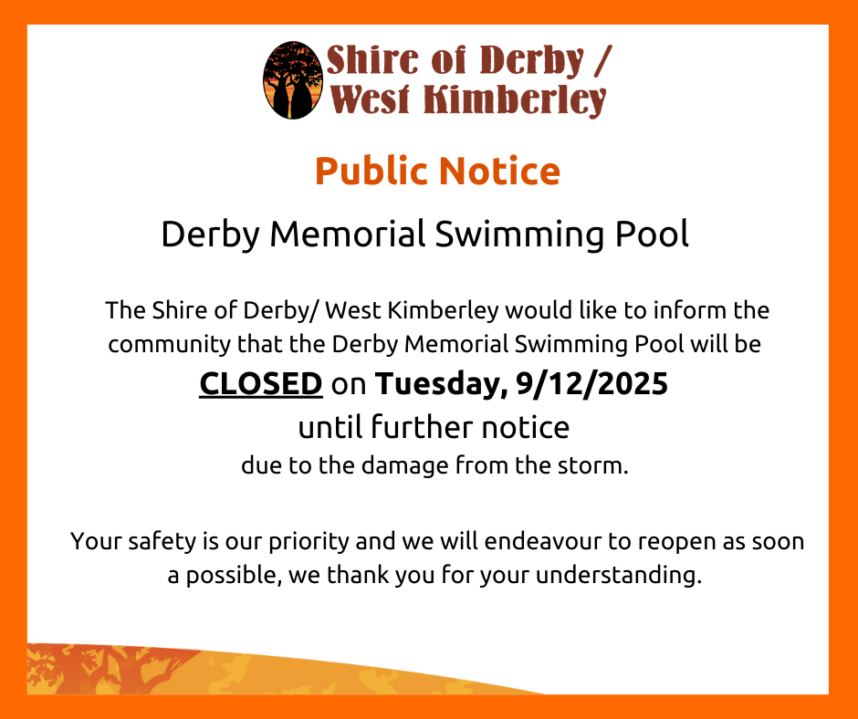 The Shire of Derby/West Kimberley would like to notify of the temporary closure of the Derby Memorial Swimming Pool due to the overnight storm.