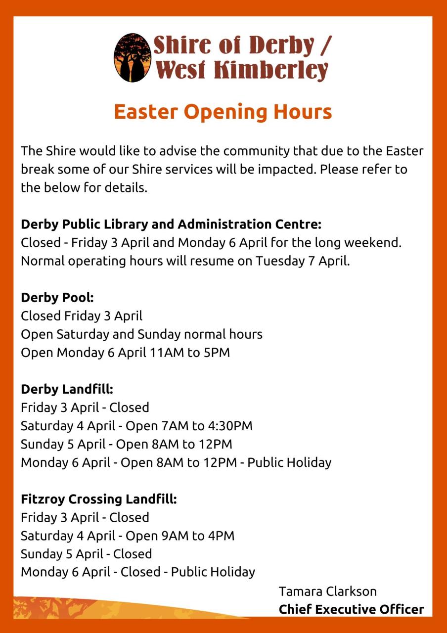 Please note due to the Easter long weekend, some of our Shire services will be impacted. Please refer to the details below.
