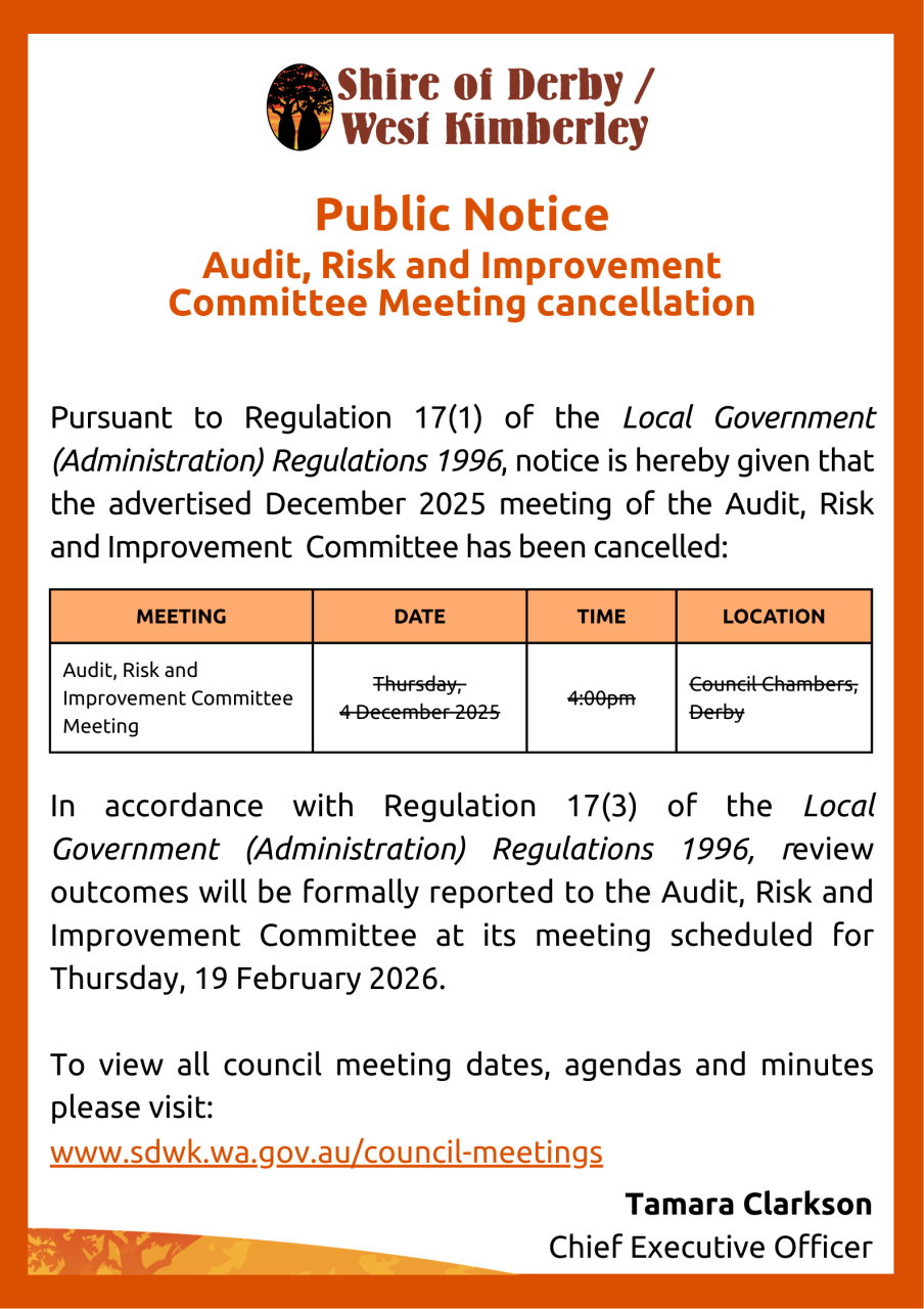 Pursuant to Regulation 17(1) of the Local Government (Administration) Regulations 1996, notice is hereby given that the advertised December 2025 meeting of the Audit, Risk and Improvement Committee has been cancelled: